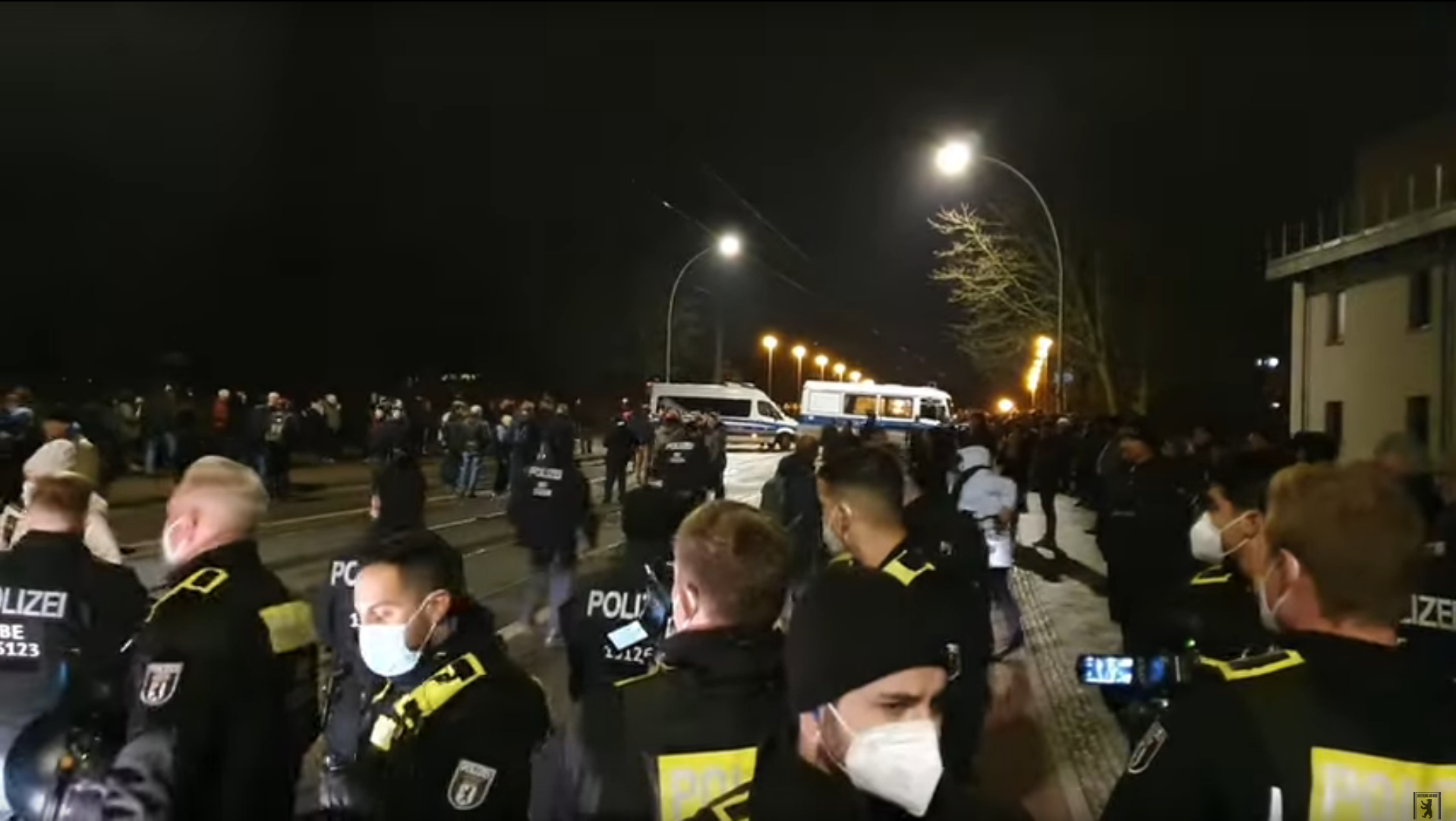 - das massive Auftreten der Berliner Polizei mit rund 20 Einsatzfahrzeugen und 2 Einsatzhundertschaften, fast ebenso viele Polizisten wie friedliche Spaziergänger